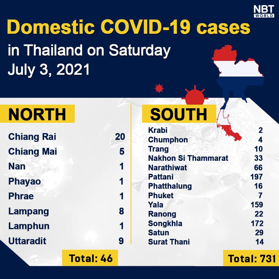 Chiangmai MailNewsPattayaUpdate COVID-19 Chonburi new case bounces to 294 today while Bangkok logs 1,971, Phuket 7 and Chiang Mai 5 By Pattaya Mail July 3, 2021 0 1586 Share on Facebook Tweet on Twitter tweet Each province’s daily domestic COVID-19 cases update in Thailand on Saturday. Total: 6,226