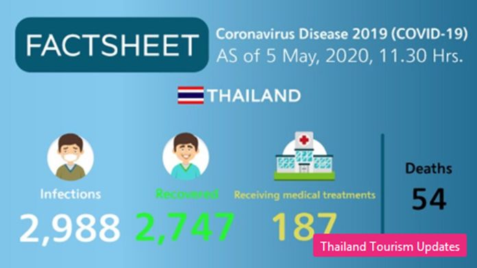 NewsThailandUpdate COVID-19 Coronavirus Disease 2019 (COVID-19) situation in Thailand By Pattaya Mail May 5, 2020 0 1378 Share on Facebook Tweet on Twitter tweet Coronavirus Disease 2019 (COVID-19) situation in Thailand as of 5 May 2020, 11.30 Hrs. (TAT)