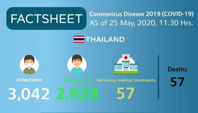 NewsThailandUpdate COVID-19 Coronavirus Disease 2019 (COVID-19) situation in Thailand By Pattaya Mail May 25, 2020 0 1264 Share on Facebook Tweet on Twitter tweet Coronavirus Disease 2019 (COVID-19) situation in Thailand as of 25 May 2020, 11.30 Hrs. (TAT)