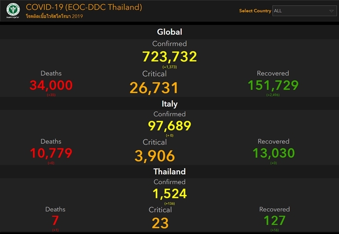 Health & WellbeingNewsThailandUpdate COVID-19 Global Situation – Corona Virus Disease (COVID-19) – Death Toll: 34,000 By Pattaya Mail March 30, 2020 0 2349 Share on Facebook Tweet on Twitter tweet Global Situation – Corona Virus Disease (COVID-19) as of March 30, 02:03 PM COVID-19 (EOC-DDC Thailand) (Sources: Department of Disease Control, Ministry of Public Health of Thailand Official Website)