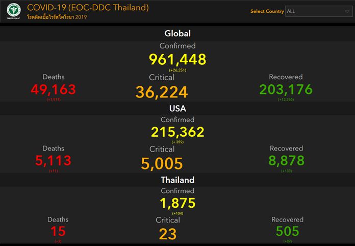 Health & WellbeingNewsThailandUpdate COVID-19 Global Situation – Corona Virus Disease (COVID-19) – Death Toll: 49,163 By Pattaya Mail April 3, 2020 0 2005 Share on Facebook Tweet on Twitter tweet Global Situation – Corona Virus Disease (COVID-19) as of April 02, 08:04 PM (Sources: Department of Disease Control, Ministry of Public Health of Thailand Official Website)