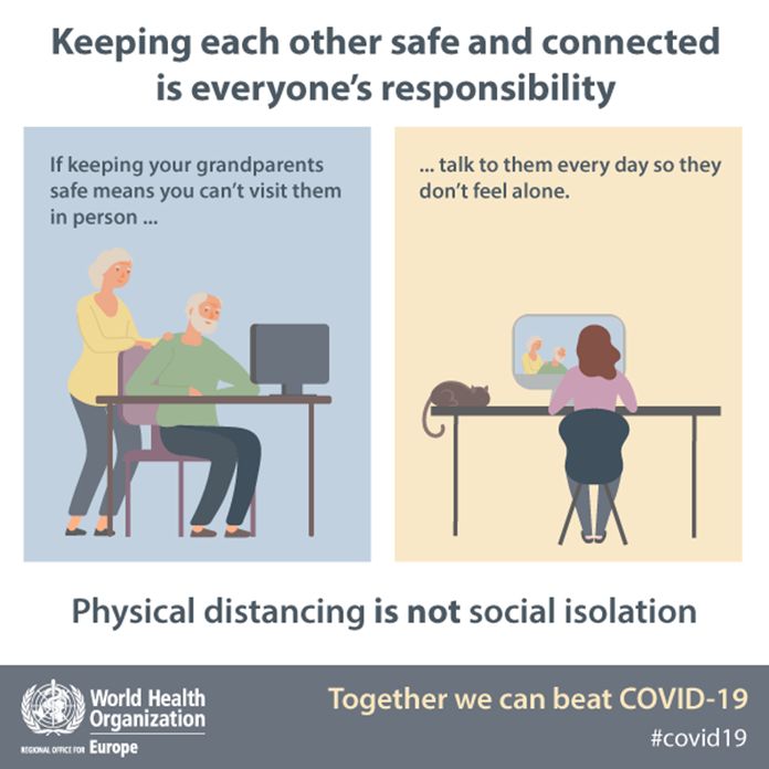 Health & WellbeingNewsThailandUpdate COVID-19 Physical distancing is not social isolation By Pattaya Mail April 6, 2020 0 2558 Share on Facebook Tweet on Twitter tweet If keeping your grandparents safe means you can’t visit them, talk to them every day so they don’t feel alone. Keeping each other safe and connected is everyone’s responsibility. Physical distancing is not social isolation. (WHO)