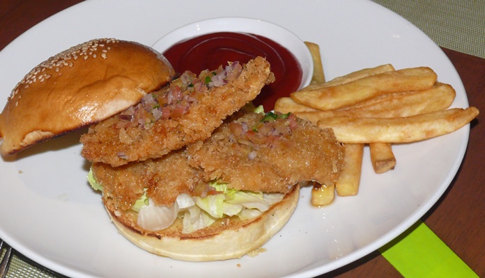 The following course for me was called Crunchy Chicken, but was a fully loaded hamburger (or I should say chicken burger), with shredded iceberg lettuce, spicy tomato salsa and sour cream. This was very filling as well as being very tasty.