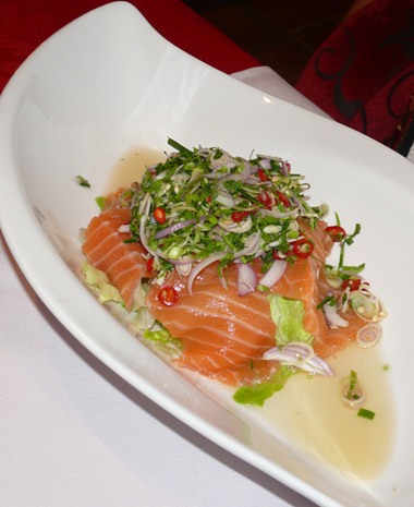There are 11 starters including an interesting salmon and red tuna duo tartar (B. 320) and a salmon, avocado and blue cheese salad (B. 280). There are also five Thai dishes (B. 150-280).