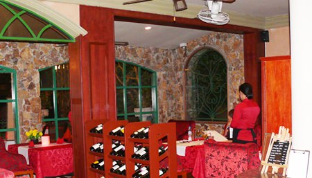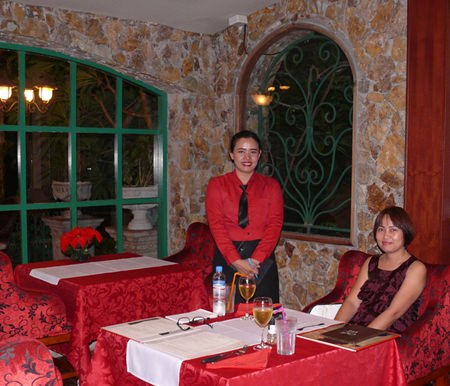 The restaurant is in two sections, the first outside overlooking the resort swimming pool and the second an air-conditioned sea of red, chairs, tablecloths, flowers carpet with a central sit-up bar. The very charming service personnel are also in bright red shirts to go with the rest of the restaurant.
