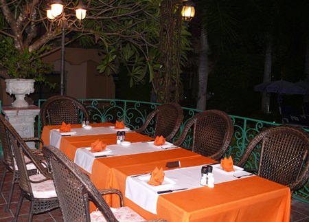 The restaurant is in two sections, the first outside overlooking the resort swimming pool.