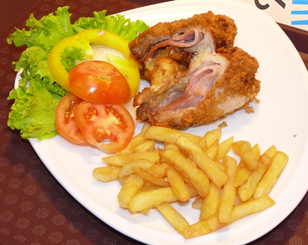 The review team was three people and Madame chose a hamburger (B. 99), which came with chips, about which she enthused for the rest of the evening. For myself I went for the Goulash soup (B. 89) followed by the Cordon Bleu (B. 129), whilst our third member selected the grilled salmon steak with lime butter sauce (B. 179).