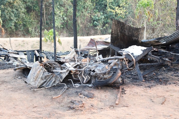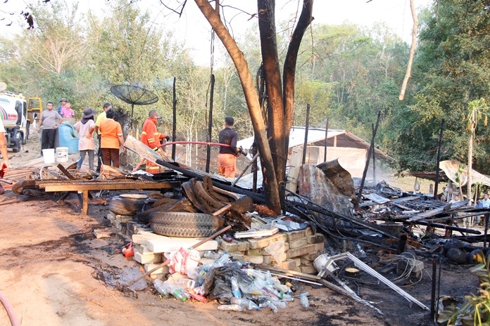 Firefighters put out the flames that consumed a tin-roofed wooden shed next to a tapioca field in Moo 1 village Feb. 19, but not before it and two motorbikes were completely destroyed.