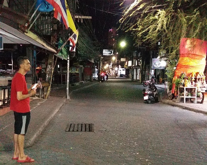 A business owner and long-time resident in Pattaya Walking Street sent me a set of photos to illustrate the actual scenes, so that I could show the world that everything in Pattaya is ‘dead’. The photos were taken at 8 p.m. on Saturday, even before the curfew was to be imposed at 10 p.m. It is obvious that not even a single soul was visible all the way deep into the heart of Walking Street.