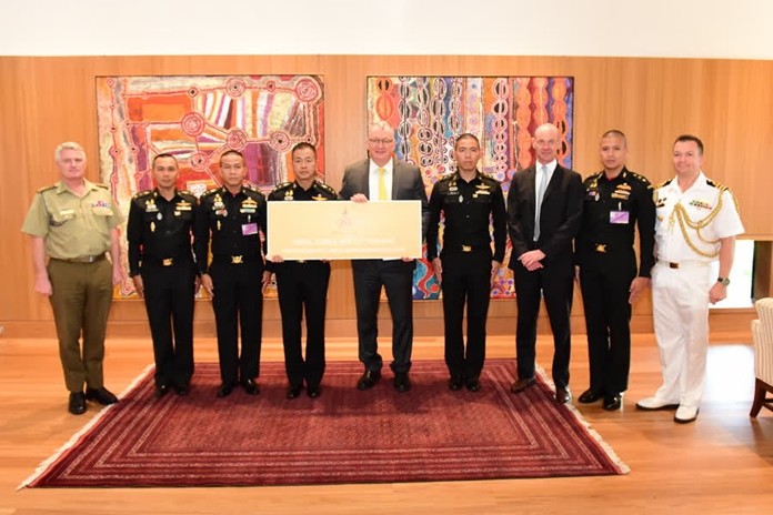 Deputizing for HRH Princess Sirivannavari Nariratana rajakanya, Col.Vithai Laithomya, Commanding officer of Royal Stable Unit of Thailand, give money to Allan McKinnon, Australian Ambassador to Thailand for wild fire recovery operations.