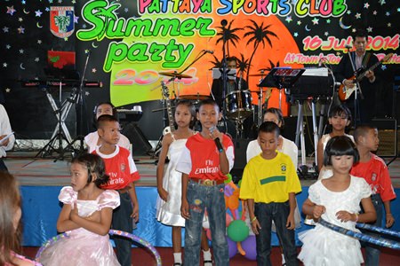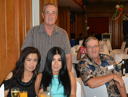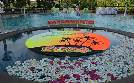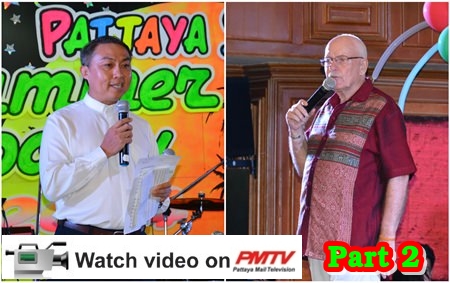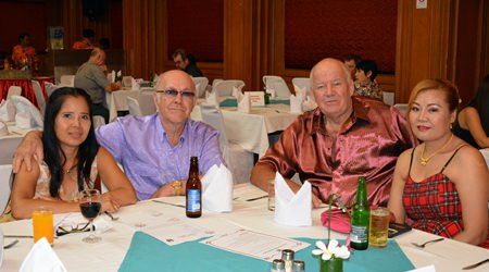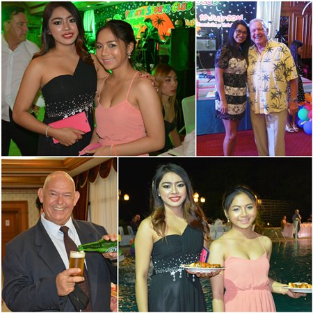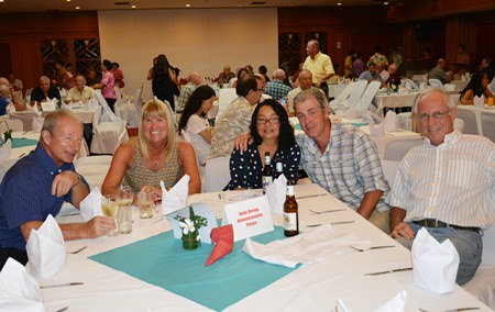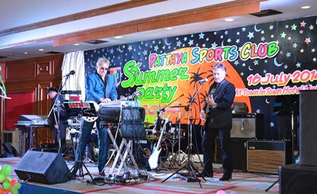 It seems to be the norm for the Pattaya Sports Club parties, as usual the rain held off and it turned out to be a fine Wednesday evening on the 16th of July as some 300 members and guests made their way to the annual PSC Summer Party at the Town In Town Hotel. In the reception there was a welcome sign and after climbing the stairs to the party venue, Town-in-Town had produced some attractive decor around the pool and as a backdrop to the stage.
