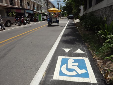 City hall officials say the paved wheelchair path running down to Big C Extra along Soi Paniad Chang now is 90 percent complete. Most of the route, which sits four centimeters above the road surface, has been paved with decorative bricks laid near the entrances of the Redemptorist and Tantarak schools.
