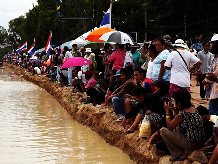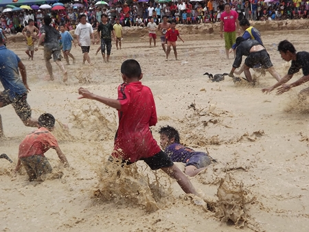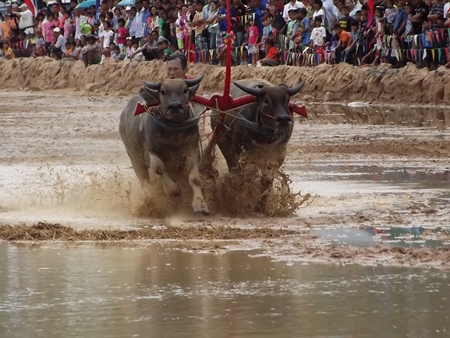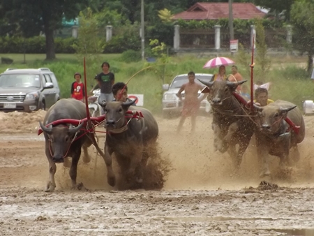 The heavy overnight rains certainly added a different challenge when traditional buffalo racing came to Mabprachan Reservoir in Pattaya Aug. 19, along with a festival that also featured greased pole climbing and a duck rodeo.