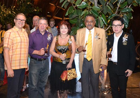 (L to R) Enjoying a glass of hot gluehwein together, Andre Brulhart, Area General Manager of Centara Grand Mirage Beach Resort Pattaya, Paul Strachan, Elfi Seitz, Pratheep S. Malhotra, MD of Pattaya Mail and Rattanachai Suttidachanai, chairman of the Tourism and Culture Council Pattaya.