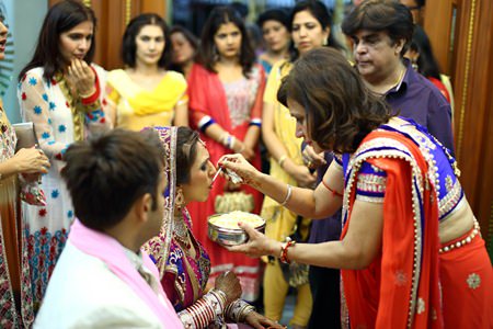 As the groom reaches the main floor, the bride’s mother welcomes him and his family with Indian delicacies. The ceremony continues with Milni (the members of bride’s family present gifts to males of the groom’s family)