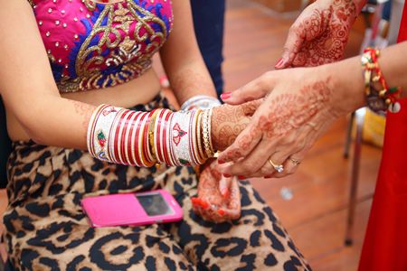 On the morning of the wedding day, the pundit arrives at the bride’s house to officiate Chura (wedding bangles of red, gold, white colors worn by brides) ceremony.