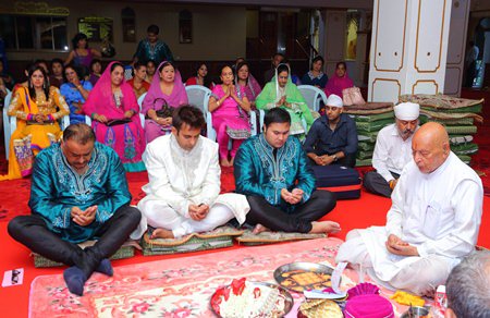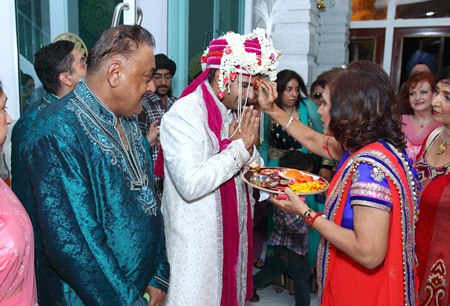 The groom’s family joins in prayers with the Pundit, and the groom’s father performs the tying of the ‘Sehra’ on the groom and the best man.