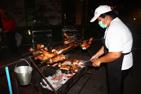 Aussie born, sometime Bavarian general manager, Brendan Daly, along with Irish Bavarian Ken Whitty in his lederhosen together with his charming Frau Kanpicha looking as pretty as ever in her exquisite ‘drindl’ welcomed the enthusiastic Pattaya community to a night of oom-pah-pah and clinking beer glasses under the stars, along with gorging on a large selection of German pork knuckles, sausages and sauerkraut, carefully prepared under the watchful eye of the hotel’s internationally trained chefs.