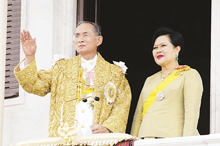 His Majesty the King and HM Queen Sirikit wave to the crowd during ceremonies Friday, June 9, 2006, in Bangkok. (AP PHOTO)