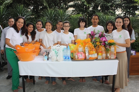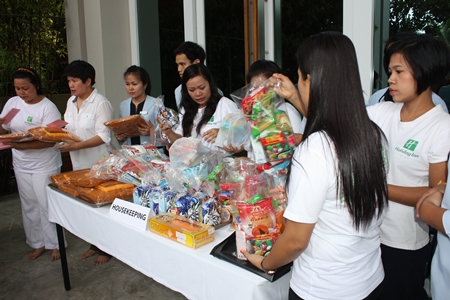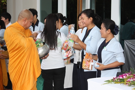 Darika Chaloeithoi, human relations director, leads employees to offer necessities to monks at the Holiday Inn Pattaya.Darika Chaloeithoi, human relations director, leads employees to offer necessities to monks at the Holiday Inn Pattaya.