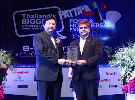 Chonburi PAO President Wittaya Kunplome (left) presents a plaque thanking Pattaya Mail Media Group Deputy Managing Director and Skål International Pattaya & East Thailand President Tony Malhotra (right) for sponsoring the Pattaya Food & Hoteliers Expo ’13.