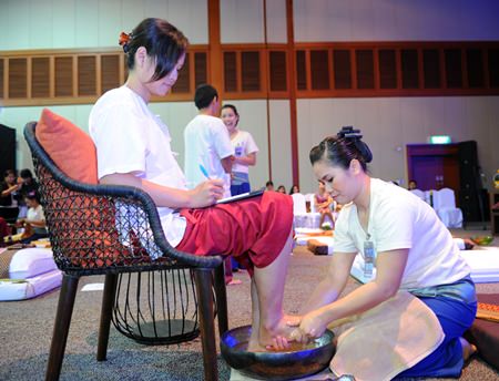 Participants in the Thai Massage Competition massage the judging committee.