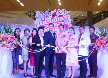 Mayor Itthiphol Kunplome (4th right), Richard Margo (5th right), Resident Manager at Amari Orchid Pattaya, and Theeraporn Jitnawa (3rd right), general manger of Central Festival Pattaya Beach, cut the garland opening Valentine’s Day 2014: Love Destination, with guests at Central Festival Pattaya Beach.