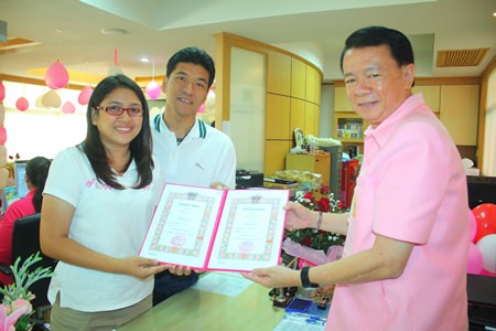 (L to R) Surachat and Asara Sopharak pose for a picture with Banglamung District Chief Sakchai Taengho after having gotten married at Banglamung office.