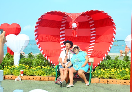 The intersection of Central and Beach Road was decorated in red and white with a “Pattaya in Love” banner hoisted so tourists could take photos for Valentine’s Day. A large number of them did just that.