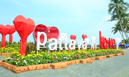 The intersection of Central and Beach Road was decorated in red and white with a “Pattaya in Love” banner hoisted so tourists could take photos for Valentine’s Day.