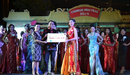 Chusak Sriwacharapong, city council member and chairman of the event, presents the winning trophy to Miss Qipao 2014, 24 year old Getmoli “Fai” Rojanapradit.Chusak Sriwacharapong, city council member and chairman of the event, presents the winning trophy to Miss Qipao 2014, 24 year old Getmoli “Fai” Rojanapradit.