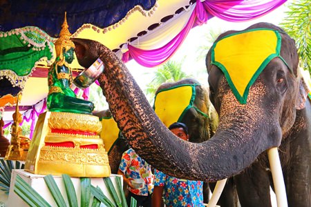 Pattaya Mayor Itthiphol Kunplome and Tourism Authority of Thailand Pattaya office Director Suladda Sarutilavan opened the festival, highlighted by elephants blowing water from their trunks over VIPs and the crowd.