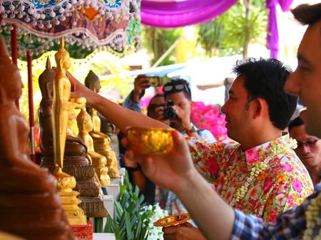 Mayor Itthiphol Kunplome bathes a Buddha image at the Nong Nooch celebrations.