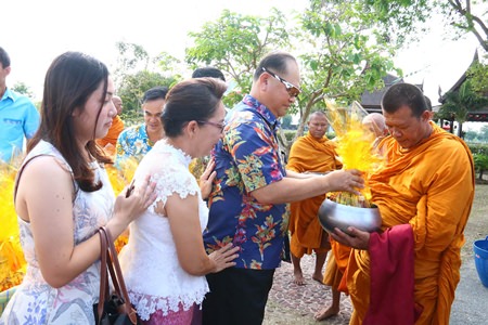 In Sattahip District, the navy’s Air and Coastal Defense Command held its merit-making ceremony for good luck led by Vice Adm. Sanon Phaem. He led military personnel and their families in giving dried food offerings to Buddhist monks.