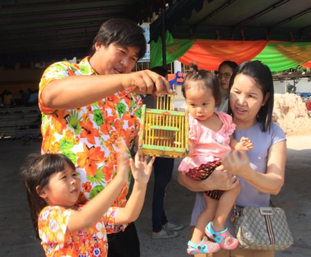 This family makes merit by releasing a bird from its cage.