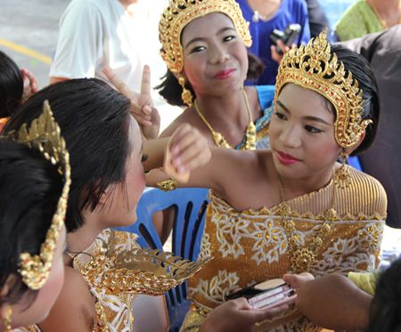 The nervous young dancers prepare by applying even more make-up.