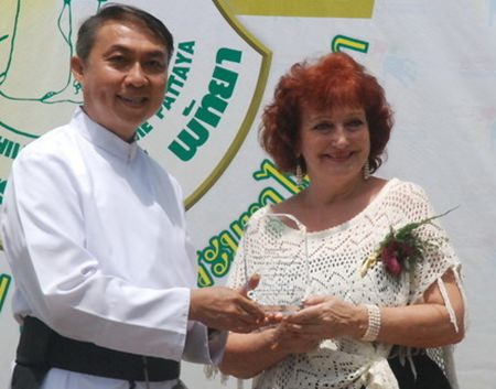 Father Peter presents Elfi Seitz from Pattaya Blatt with an award of appreciation.