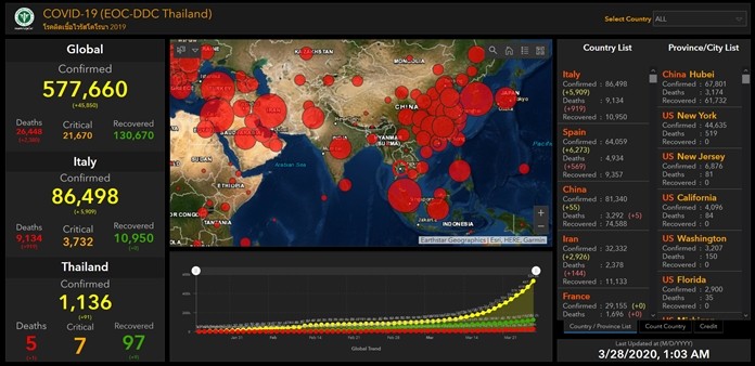Health & WellbeingNewsThailandUpdate COVID-19 Global Situation – Corona Virus Disease (COVID-19) – Death Toll: 26,448 By Pattaya Mail March 28, 2020 0 1661 Share on Facebook Tweet on Twitter tweet Global Situation – Corona Virus Disease (COVID-19) as of March 28, 01:03 AM COVID-19 (EOC-DDC Thailand) (Sources: Department of Disease Control, Ministry of Public Health of Thailand Official Website)