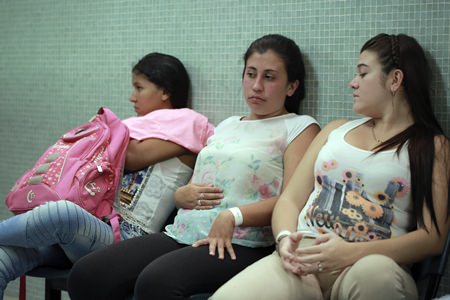 In this Thursday, Feb. 11, 2016 file photo, Daniela Rodriguez, 19, six-weeks pregnant, sits between two other women who are expecting, as they wait for test results after being diagnosed with the Zika virus at the Erasmo Meoz Hospital in Cucuta, Colombia. (AP Photo/Ricardo Mazalan)