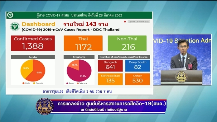 As of 29 March, total cases in Thailand have reached 1,388 with 7 fatalities, while more than half of those infected are hospitalized in Bangkok.
