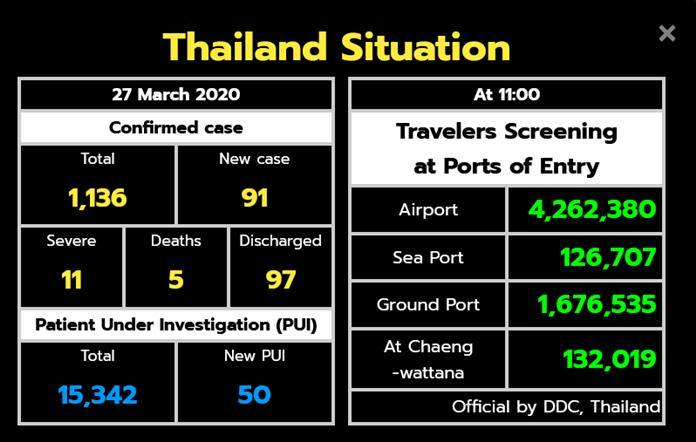 Health & WellbeingNewsThailandUpdate COVID-19 Thailand Situation Corona Virus Disease (COVID-19) – confirmed cases 1,136 By Pattaya Mail March 27, 2020 0 2068 Share on Facebook Tweet on Twitter tweet Thailand Situation Corona Virus Disease (COVID-19) – confirmed cases 1,136 (Sources: Department of Disease Control, Ministry of Public Health of Thailand)