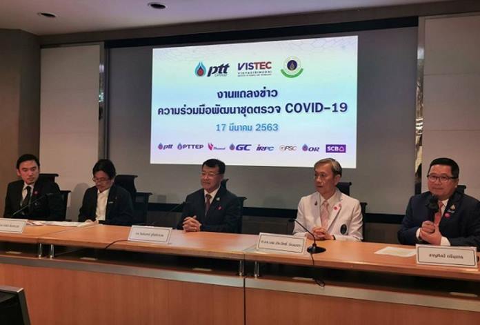 Chansin Treenuchagron, president and chief executive officer of PTT Plc, said PTT and VISTEC developed the test kits with the help of many partners including the Broad Institute, the Massachusetts Institute of Technology, Harvard, the Department of Medical Sciences, the Faculty of Medicine Siriraj Hospital, the Faculty of Science at Mahidol University and Prapokklao Hospital. PTT and Siam Commercial Bank funded the development.