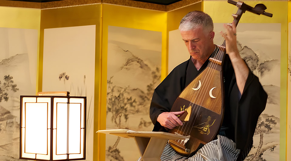 The biwa is a four-string Japanese lute which originated in China or the Middle East and first appeared in Japan during the 8th century. It is played with a large triangular plectrum and with its distinctive incisive tone, it was a popular instrument in the Japanese court and in the court orchestra. The shakuhachi is a large end-blown flute made of bamboo and it began to appear in Japanese court orchestras during the 16th century.