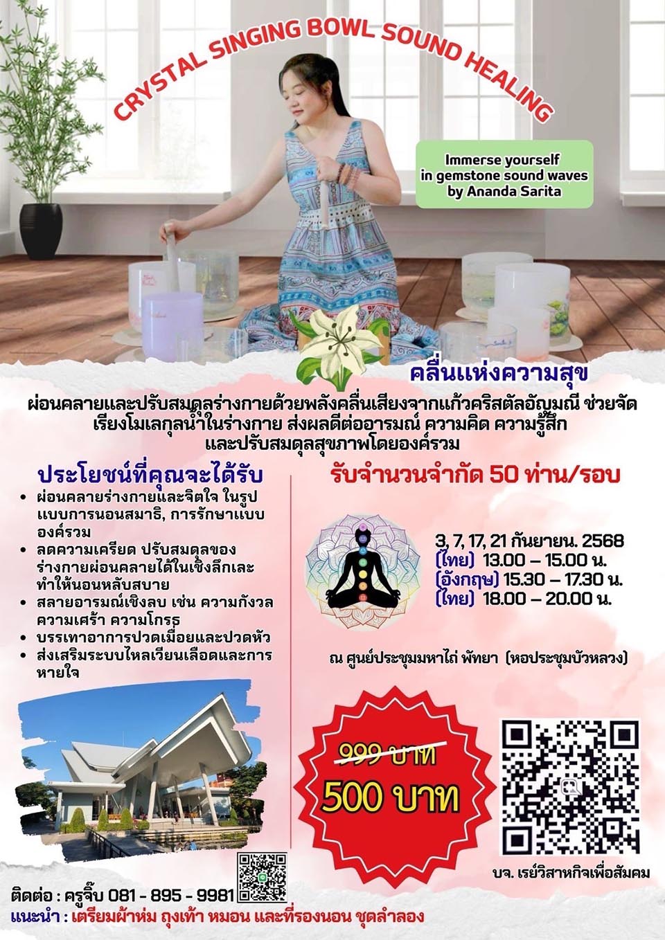 Crystal Singing Bowl Sound Healing sessions are scheduled to continue on September 3, 7, 17, and 21, with three time slots: 1:00–3:00 PM for Thai participants, 3:30–5:30 PM for foreigners, and 6:00–8:00 PM for Thai participants. A special deal of 500 baht per person is available. For more information, interested participants can contact 081-895-9981.