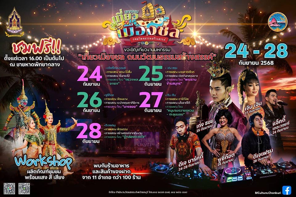 PATTAYA, Thailand – The Chonburi Provincial Cultural Office invites everyone to the “Chonburi Culture & Creativity Street Festival” from September 24–28, at Pattaya Central Beach. Enjoy a full lineup under the theme: “See, Taste, Shop, Snap, Chill.”