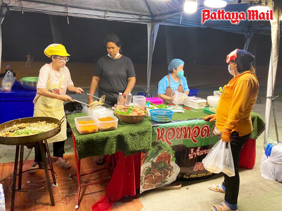 Walaiphan Sonsermsombat, 51, said that she did quite well selling her “Jay Pum Pad Thai” and oyster omelets on the beach in North Pattaya over the weekend, so after the concerts ended Aug. 7, she decided to do a good deed by cooking her special noodles for the city’s environment department sanitation workers.