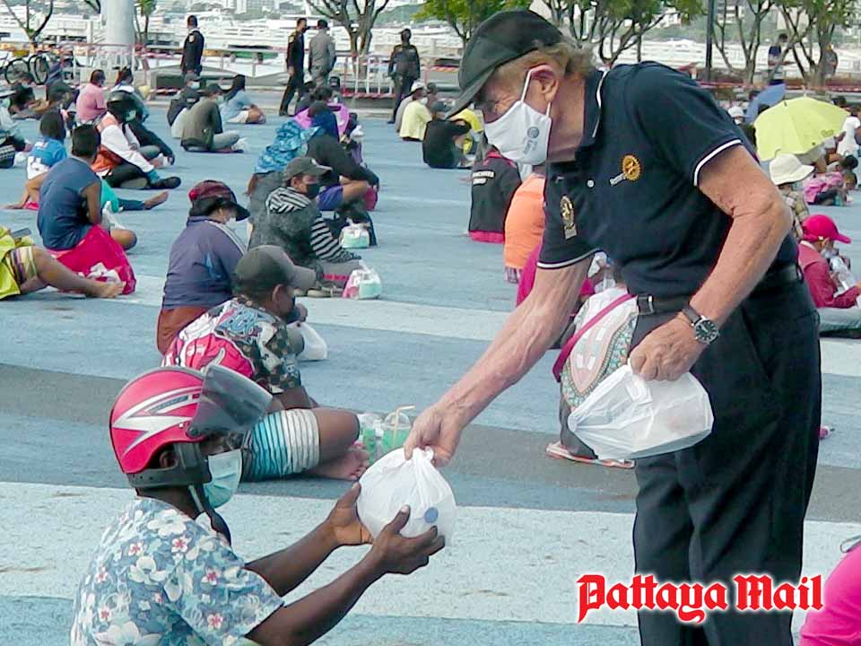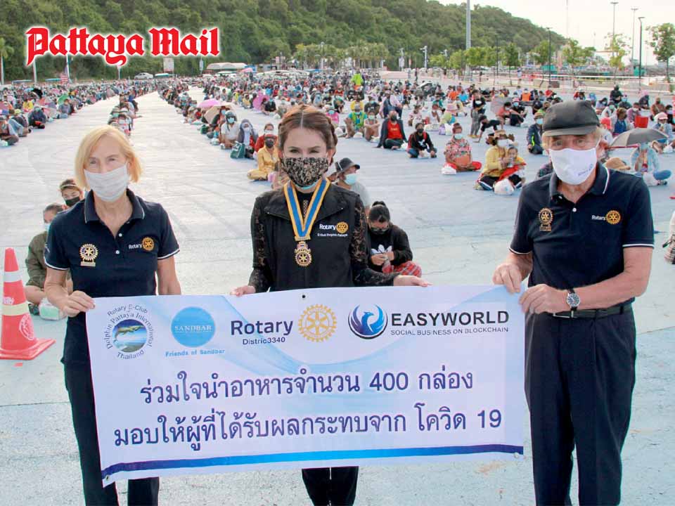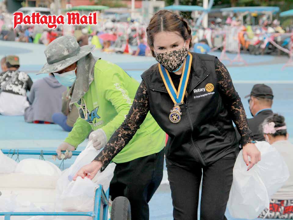 On August 1-2, members of the Rotary Club of Dolphin Pattaya International, led by President Chanunda Kongphol, CP Dr. Otmar Deter and PP Dr. Margret Deter, brought a pickup load of food boxes and water to be distributed to the needy at the sprawling grounds of the Bali Hai Pier.