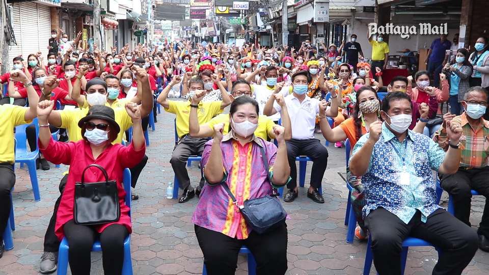 Mayor Sonthaya Kunplome, his wife Sukumol and local government and business employees grabbed brooms and washed down the South Pattaya nightlife strip, calling it a measure to prevent the spread of Covid-19.