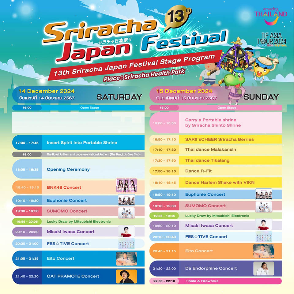 SRIRACHA, Thailand – The 13th edition of the Sriracha Japan Festival will take place on December 14-15, from 4:00 PM to 10:20 PM at the Koh Loy Sriracha Park (Health Park).