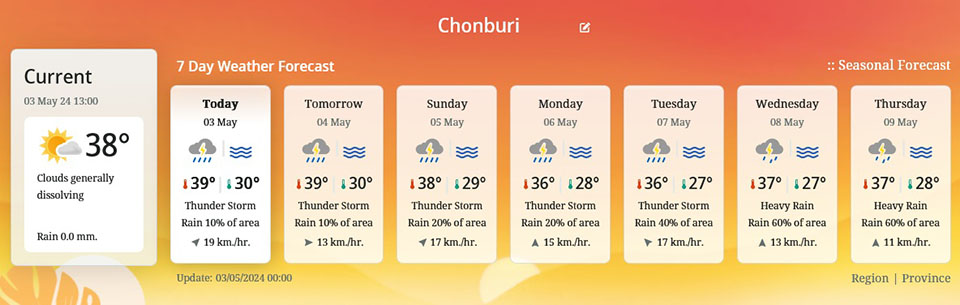 During May 3 to 5, westerly winds from Myanmar will pass through the upper northern and northeastern regions. While from May 6 to 7, there will be an influence of easterly and southeasterly wind convergence covering the northeastern, eastern, central, and lower northern regions of Thailand. With hot to very hot weather prevailing in the upper part of Thailand, this has led to the occurrence of tropical storms in several areas, characterized by heavy rain, strong winds, and localized hailstorms. Thunderstorms may also occur.